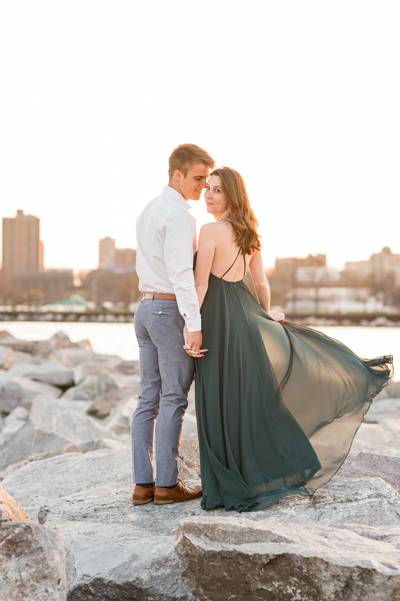 They're cute, they love Jesus, they love each other, they're fun to be around and make my job look easy. It was a win-win-win. Jenna and Stephen's engagement session was amazing, from the dreamy golden light to the windy weather, and Jenna's flowy dress, it was pretty much all my favorite. I can't say enough good things about how sweet these two are on and off camera, they're so down to earth, ridiculously smart, and oh so kind. This was my first time taking engagement photos at Lake Park and McKinley Marina, and it did not disappoint! I love how the light looks when the sun setting over the city and creating sparkly reflections on the water! But what I really love is how these two look with the sun setting over the city and creating sparkly reflections on the water in the background :) Aren't they stunning?!?